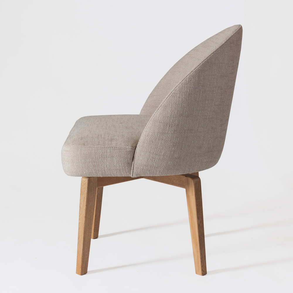Base y estructura interna fabricada con madera maciza de roble para mayor resistencia estructural. Tapicería fija en tela; su espaldar esta hecho en forma curva para darle una mayor ergonomia respecto al cuerpo.