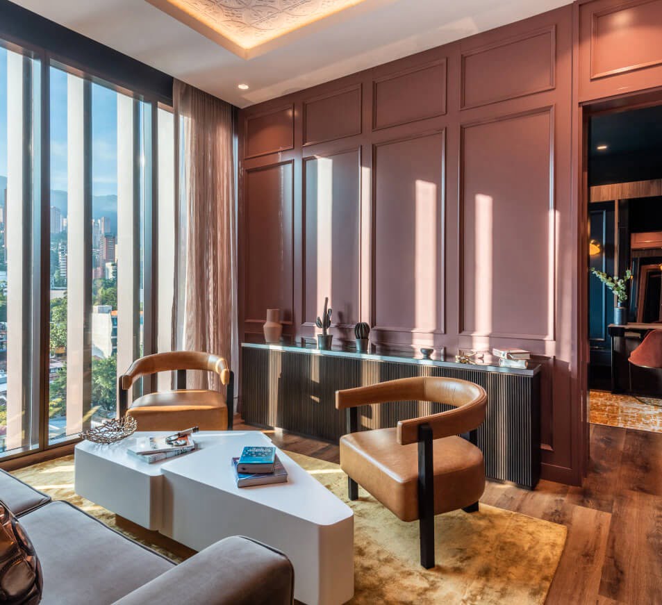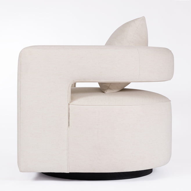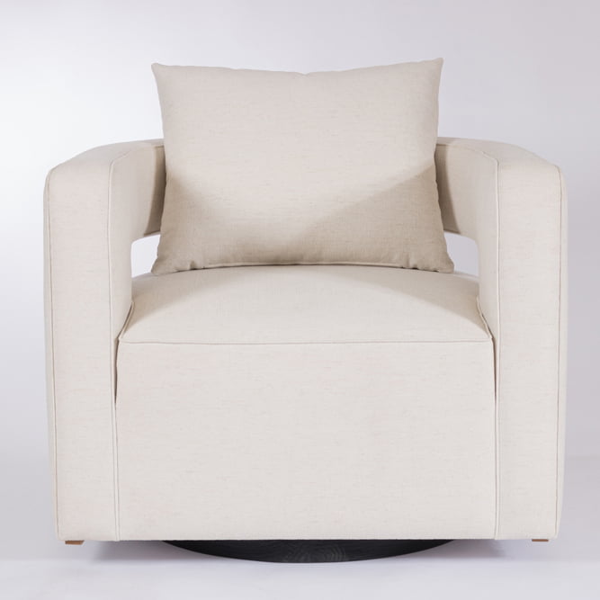 Perfecta para salas o lobbies, esta poltrona reposa sobre una base giratoria en madera de roble que le agrega dinamismo a los espacios