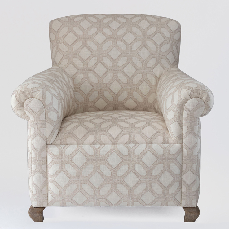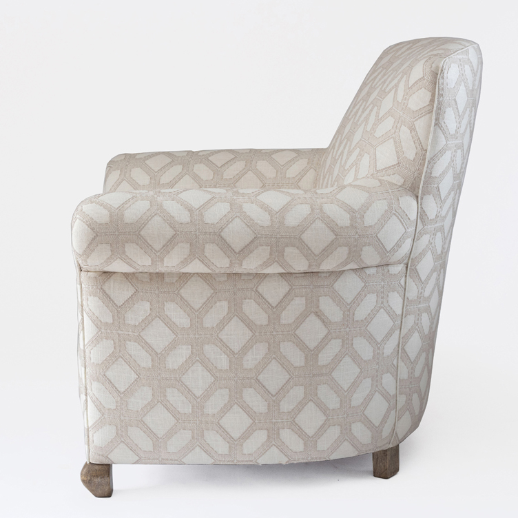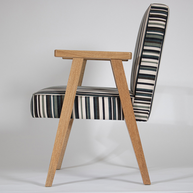 Nuestro sillón Boho cuenta con una tapicería fija en tela. Patas en madera maciza de roble