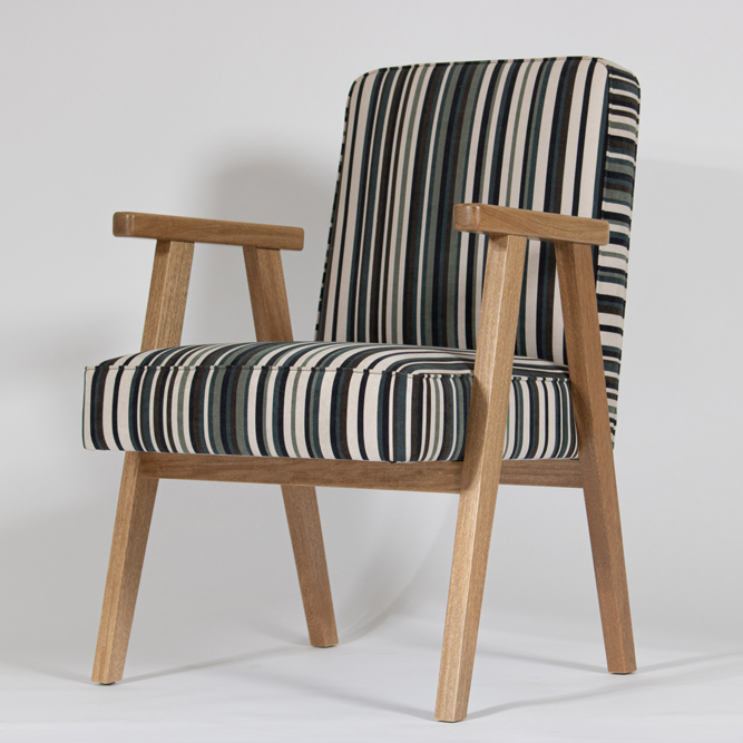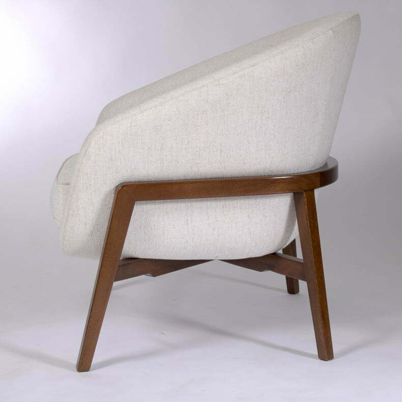 Poltrona con tapicería fija en tela, el cuerpo del asiento y el espaldar reposa sobre una base de madera maciza perimetral.