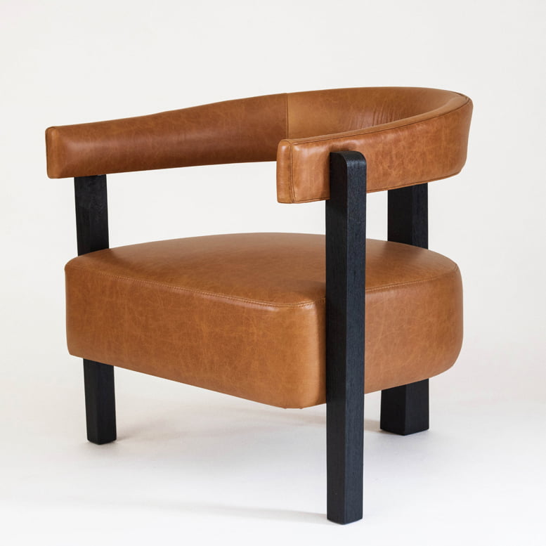 Poltrona tapizada en cuero envejecido, espaldar en forma de ¨herradura» para darle una mayor ergonomia al espaldar, patas en madera maciza de roble con acabado negro poro abierto mate.