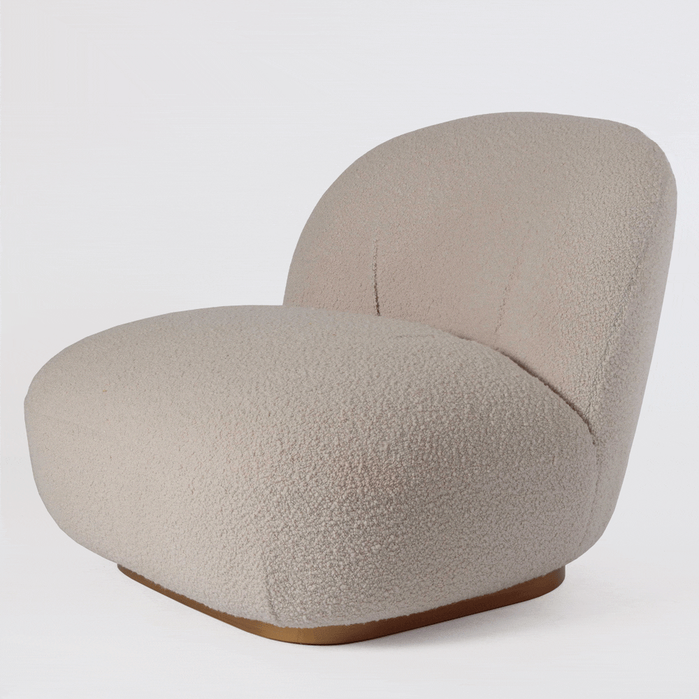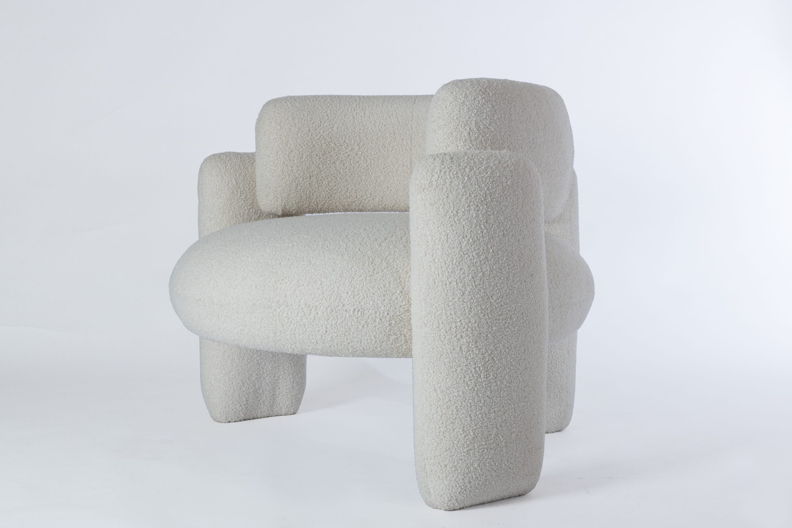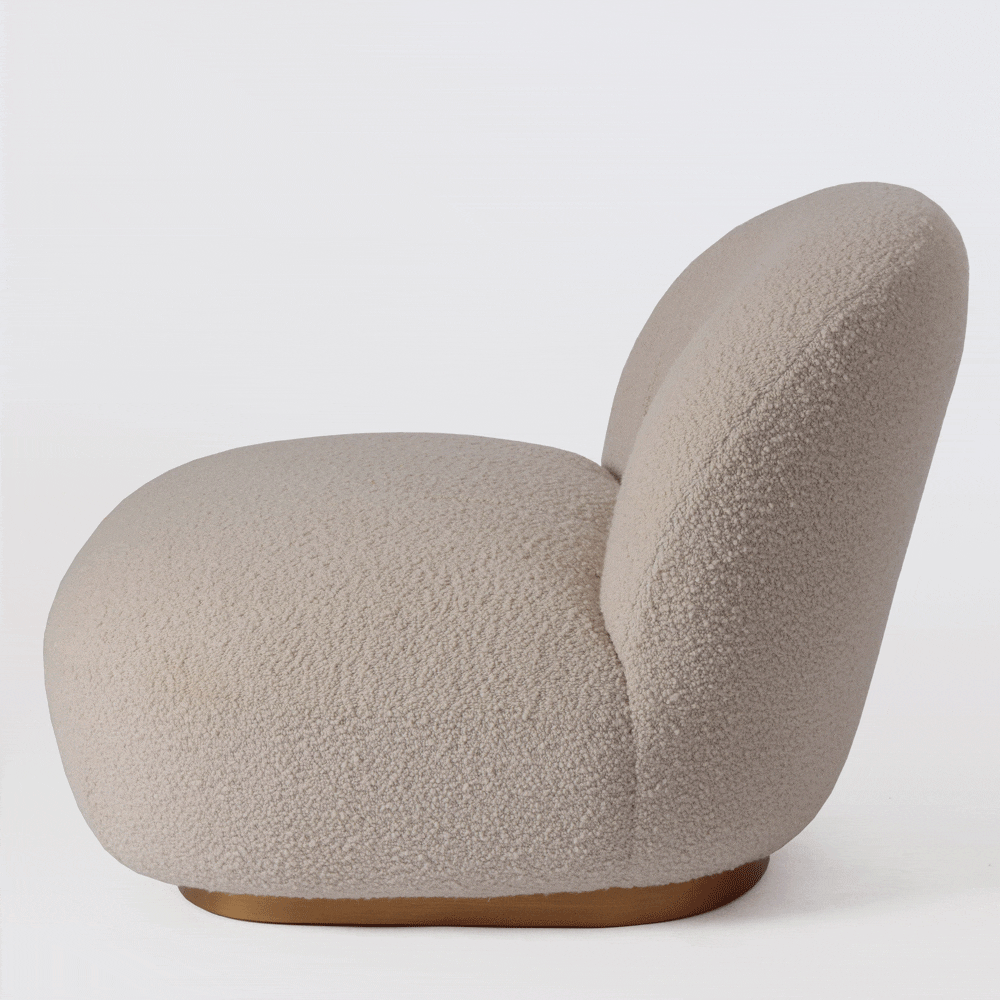 La poltrona «Ovo», tapizada en tela tipo Boucle, es excepcionalmente cómoda gracias a su diseño ergonómico, que asegura un soporte adecuado para la espalda y los brazos.