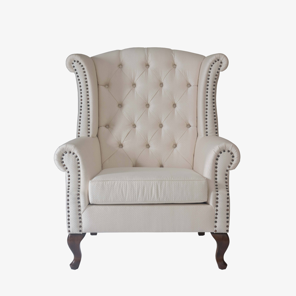Sillón con diseño clásico estilo Chester. Cuerpo de gran volumen con tapicería fija en tela capitoneada. Patas en madera maciza de roble.